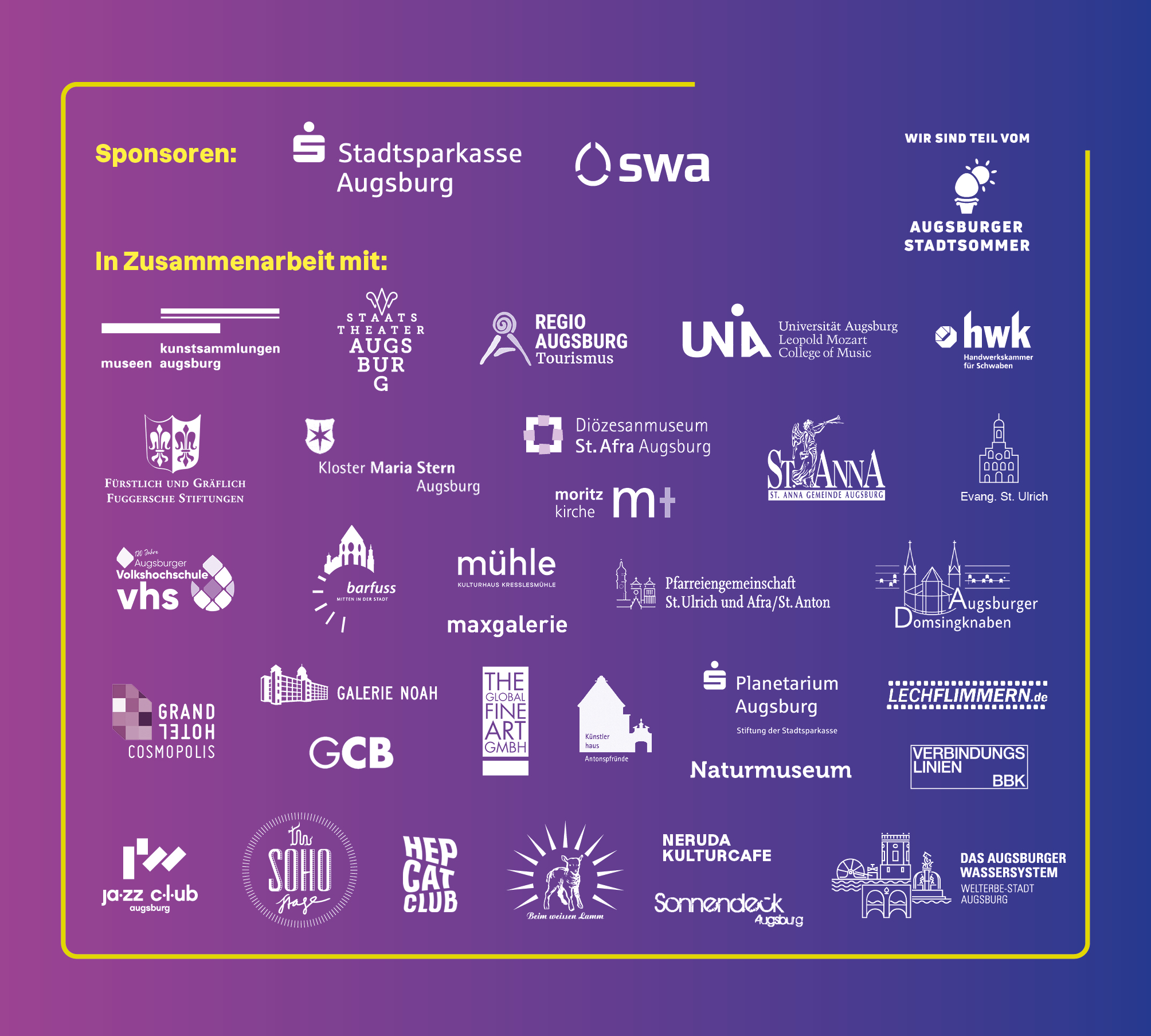 Es gibt auch an der Abendkasse im Rathaus, Kleinem Goldenen Saal, in der Kresslesmühle, St. Anna (Kreuzgang), Evang. St. Ulrich, im Maximilianmuseum und im Schaezlerpalais Tickets zum Abendkassenpreis.