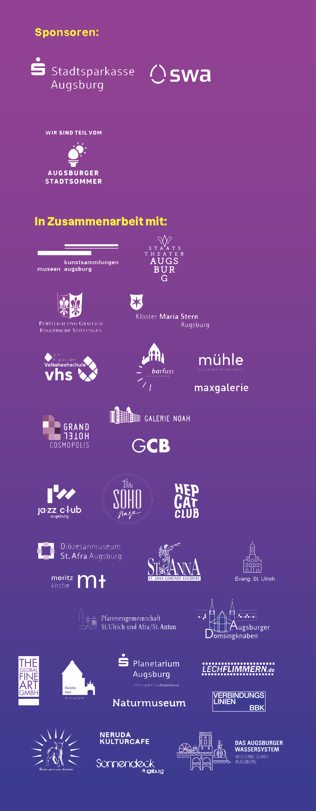 Das Programmheft in gedruckter Form gibt es an allen Spielorten der Langen Kunstnacht und an diversen Auslegestelle in Augsburg und Umgebung. Auf jeden Fall immer an unserer Haupt-VVK-Stelle, der Bürgerinfo am Rathausplatz.
