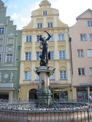 MoritzplatzDer Merkurbrunnen auf dem Moritzplatz ist der kleinste der drei sogenannten Augsburger Prachtbrunnen. Adriaen de Vries entwarf die Brunnenanlage mit der bekrönnenden Hauptfigur des Götterboten und lieferte die Modelle. Nachdem der Augsburger Gießer Wolfgang Neidhardt die Figuren gegossen hatte, konnte die gesamte Anlage 1599 eingeweiht werden. Sowohl der Merkurbrunnen alsauch der benachbarte Herkulesbrunnen gehören zu den Hauptwerken von de Vries.